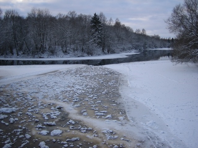 Igatahes väga toredaid emotsioone pakkus kanuuga üle jõe sõit, kuna jõe kaldad olid mõlemalt poolt ca 8 meetri ulatuses jääs ning keskel oli umbes 6-7 meetrine must vesi. Ega midagi - meil oli tegelikult aastaid tagasi jäätunud jõel kanuumatkamise kogemus olemas, samuti polnud ka Aivar esimest korda paadis :-) Nii me siis sealt üle saimegi - hooga jääserva peale sõites murdus esimene osa jääst ära, kuid 1,5 meetri kaugusel mustast veest oli juba täiesti kindel jääpind.